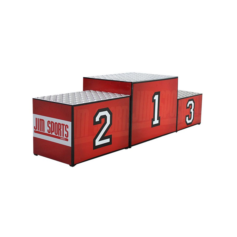 PODIUM DE ESTRUCTURA METáLICA CON CHAPA SUPERIOR ANTIDESLIZANTE. PROVISTO TAMBIéN DE CHAPA METáLICA FRONTOLATERAL CON LA POSIBILIDAD DE PERSONALIZACIóN.