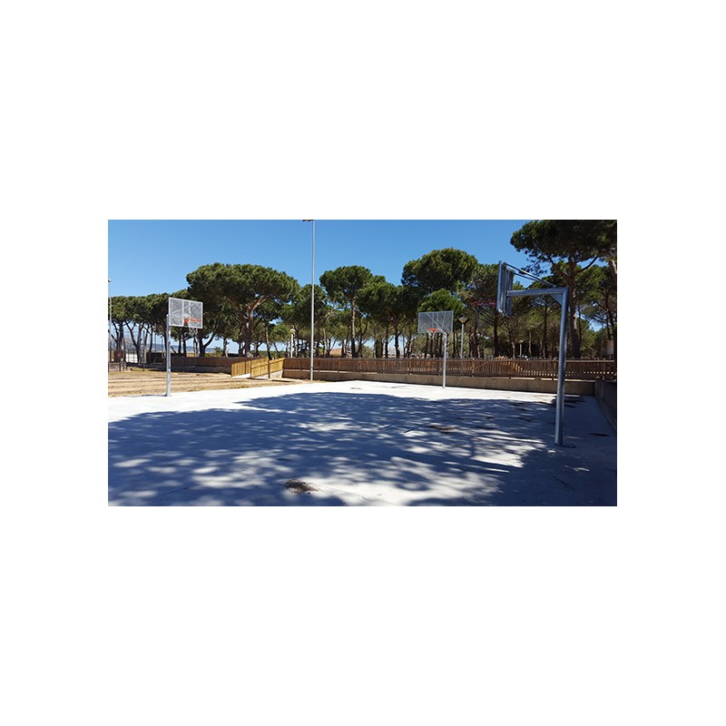 CANASTAS DE SECCIóN REDONDA PARA EMPOTRAR AL SUELO MEDIANTE UNA BASE DE ANCLAJE (INCLUIDA). IDEAL PARA PISTAS DEPORTIVAS DE EXTERIOR. VUELO CANASTAS: MINIBASKET: 1 MT. CONTIENE DOBLE SISTEMA DE TUERCAS DE NIVELACIóN, TANTO EN SOPORTE DE TABLERO COMO EN BASE DE ANCLAJE, INCORPORA TAMBIéN DOS TIRANTES SUPERIORES DE ESTABILIZACIóN A LAS ESQUINAS DEL TABLERO. INCLUYE ADEMáS DE LA BASE DE ANCLAJE ARO MACIZO, RED ANTIVANDáLICA Y TABLERO METALICO PERFORADO. ACABADO GALVANIZADO GRIS. EL MATERIAL METáLICO QUE FORMA PARTE DE LA CANASTA LLEVA UN PROCESO DE GALVANIZADO EN CALIENTE POR INMERSIóN QUE PROTEGE EL HIERRO DE LA OXIDACIóN AL EXPONERSE ANTE UNA ALTA CORROSIóN (IDEAL PARA ZONAS COSTERAS)