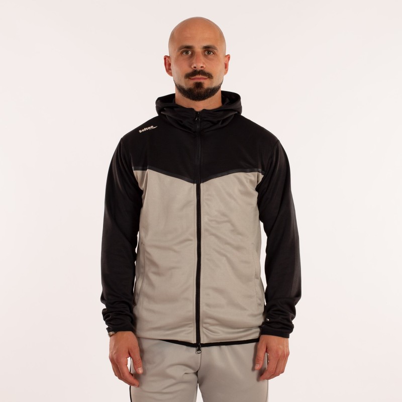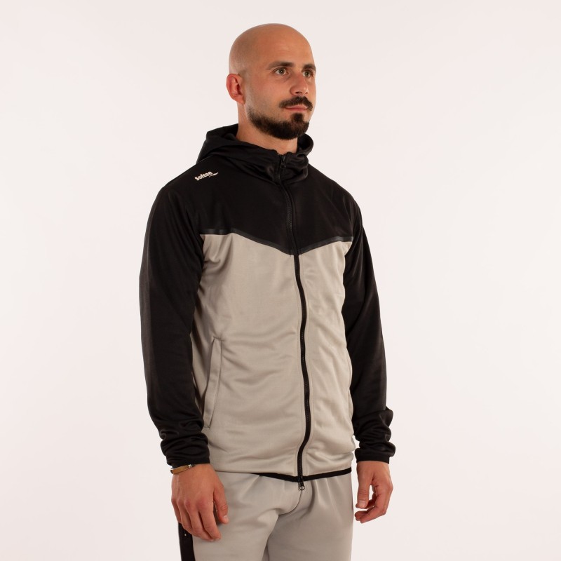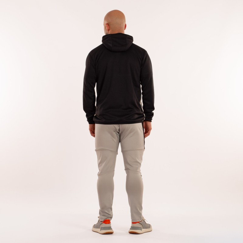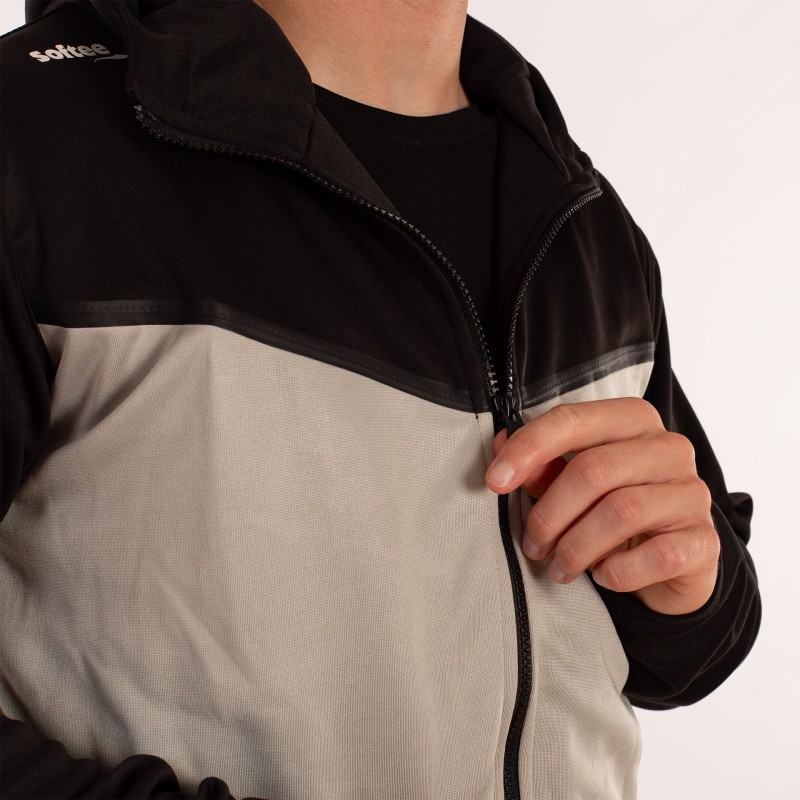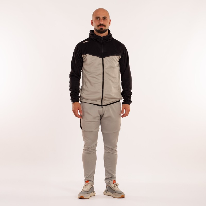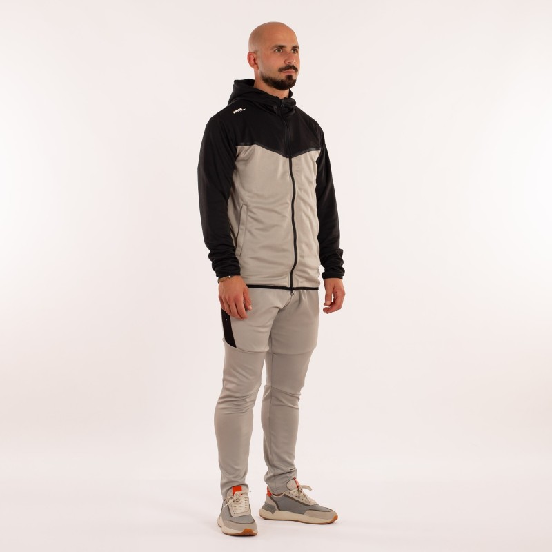 LA CHAQUETA DE MANGA LARGA, CREMALLERA COMPLETA EN EL FRENTE Y CAPUCHA. PRINCIPALMENTE PREDOMINA EL COLOR GRIS Y MANTIENE EL NEGRO EN EL CUELLO, CAPUCHA Y MANGAS. LA CHAQUETA CUENTA CON DOS BOLSILLOS CON CREMALLERA Y EL PANTALóN DOS SIN CREMALLERA Y OTROS DOS EN LOS LATERALES CON CREMALLERA. ADEMáS ESTE CUENTA CON CINTURA ELáSTICA CON CORDóN PARA UN PERFECTO AJUSTE. CORTE RECTO, SIN PUñO.
