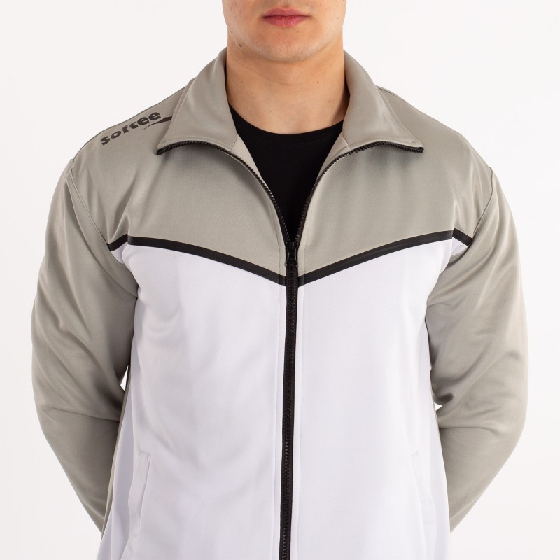 LA CHAQUETA DE MANGA LARGA Y CREMALLERA COMPLETA EN EL FRENTE. PRINCIPALMENTE PREDOMINA EL COLOR BLANCO Y MANTIENE EL GRIS DEL PANTALóN EN CUELLO Y MANGAS. LA CHAQUETA CUENTA CON DOS BOLSILLOS CON CREMALLERA; AL IGUAL QUE EL PANTALóN. ADEMáS ESTE CUENTA CON CINTURA ELáSTICA CON