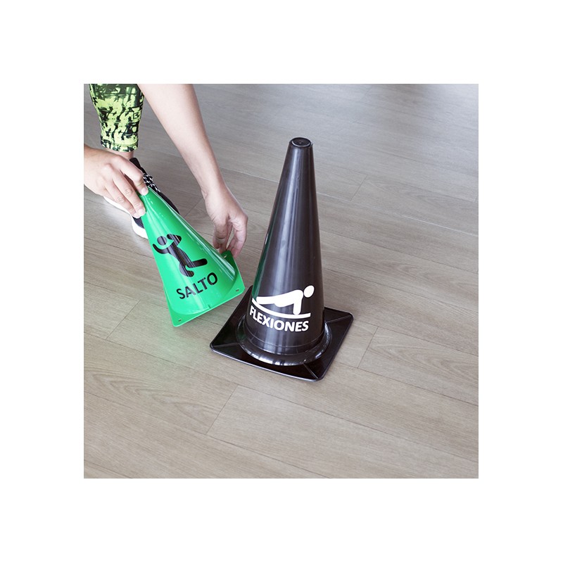 CONOS SEMIRRíGIDOS DE 23CM DE ALTURA CON DISEñO DE TRAINING EN VINILO (ABDOMINALES, FONDOS...). TE AYUDAN A CREAR CUALQUIER CIRCUITO DE ENTRENAMIENTO CON DIFERENTES EJERCICIOS.