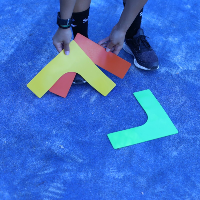 SET FABRICADO EN MATERIAL DE GRAN CALIDAD Y DURABILIDAD. DESTINADO A DELIMITAR ZONAS DE ENTRENAMIENTO. COMPUESTO POR 6 PIEZAS, TRAZOS áNGULO RECTO. COLORES: AMARILLO, AZUL, MARINO, ROJO, NARANJA Y VERDE. MEDIDAS: 25,5X25,5X7,5CM.