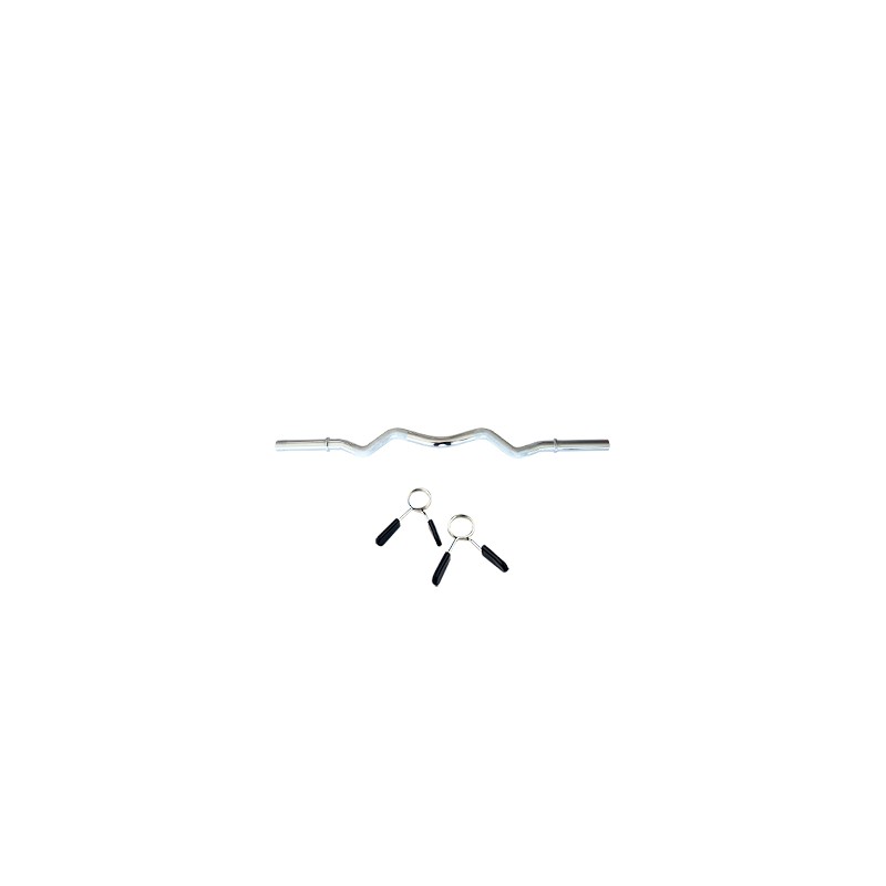 BARRA DE DOMINADAS CROMADA EN FORMA DE Z QUE COLOCA LAS MUñECAS EN UNA POSICIóN MáS NATURAL AL ENTRENAR BíCEPS O TRíCEPS. SE SUMINISTRA CON UN KIT DE BLOQUEO DE MUELLE. PESO: 7 KG. LONGITUD: 120 CM. DIáMETRO: 30 MM
