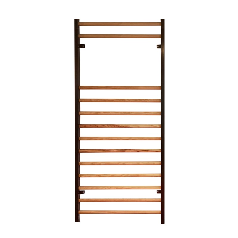 FORMADA POR 13 LISTONES A UNA DISTANCIA EQUIDISTANTE DE 11CM, EXCEPTO EL HUECO SUPERIOR DEL SEGUNDO Y TERCER LISTóN QUE ES DE 55CM. TODOS ELLO ENGARZADOS A TRAVESAñOS METáLICOS VERTICALES DE SECCIóN 120X40X2MM EN COLOR NEGRO.