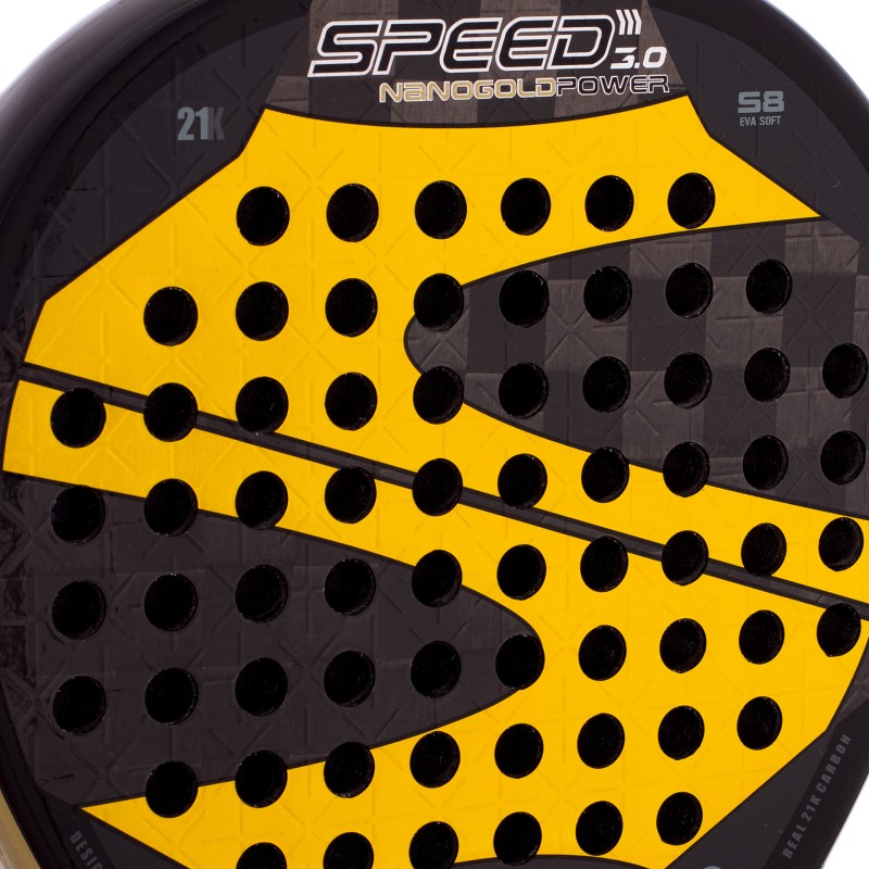 LA PALA SPEED GOLD POWER 3.0 DESTACA POR SU DISEñO EN TONOS DORADOS METALIZADOS. UN DISEñO QUE NO PASA POR INADVERTIDO EN LAS PRINCIPALES PISTAS DE PáDEL DEL MUNDO. CUENTA CON ACABADO 21K Y CARAS RUGOSAS 3D QUE APORTAN GRANDES EFECTOS A LA HORA DEL JUEGO. SU FORMA DE LáGRIMA APORTA UN EXCELENTE EQUILIBRIO ENTRE POTENCIA Y CONTROL DE LA BOLA.