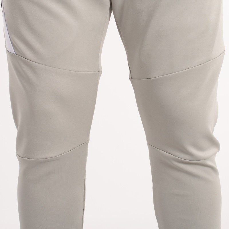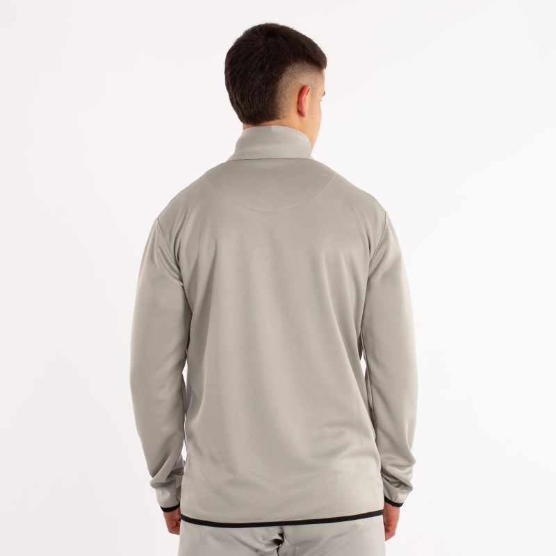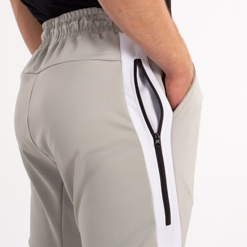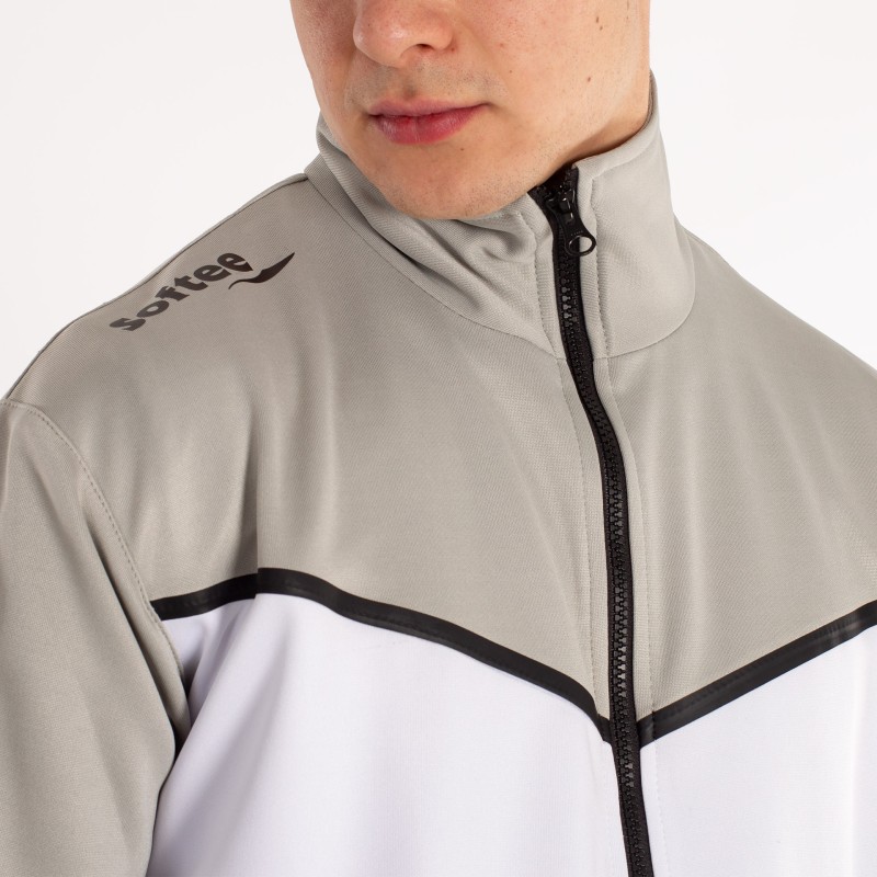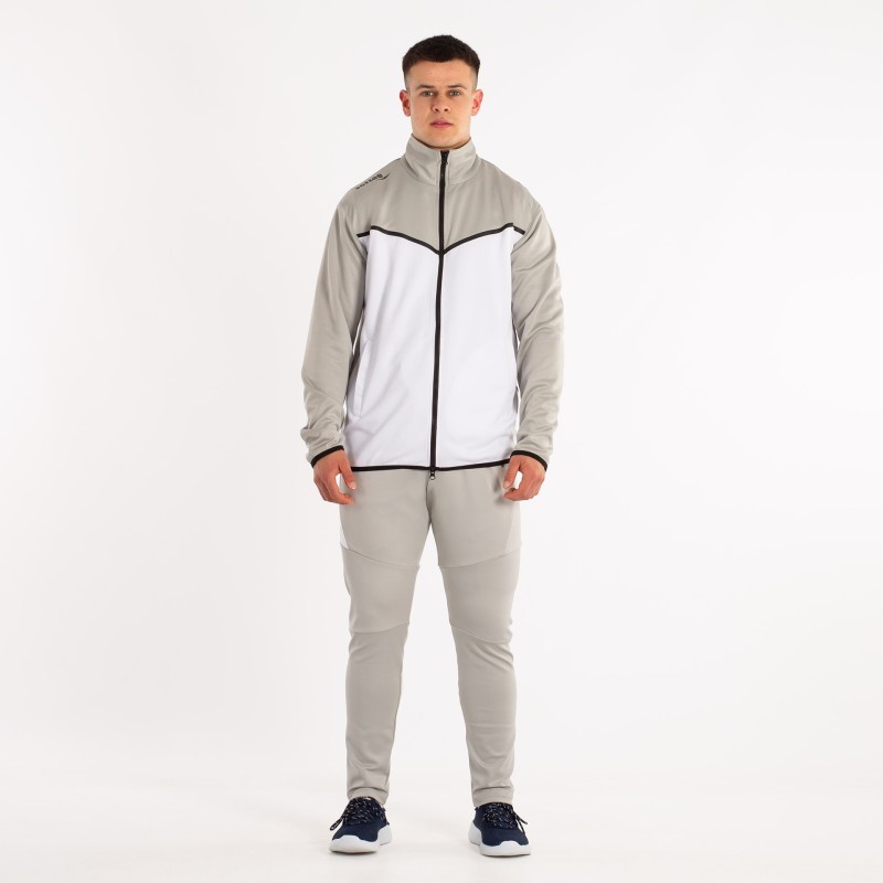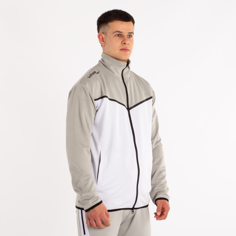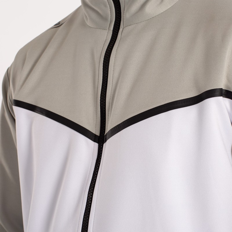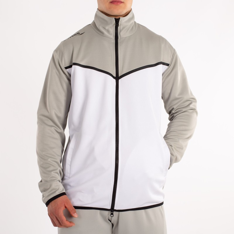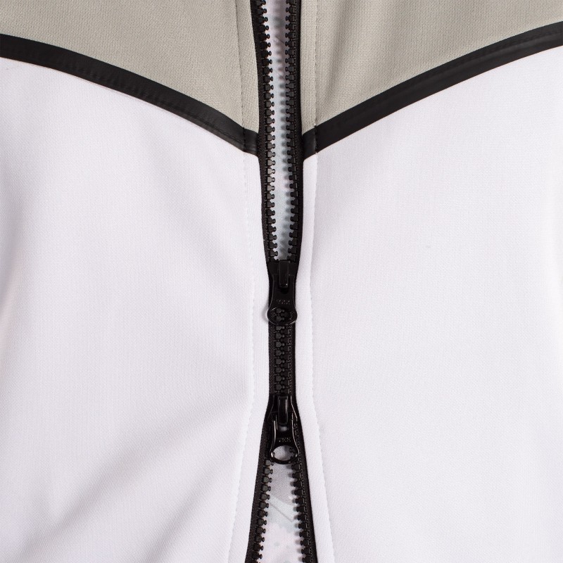 LA CHAQUETA DE MANGA LARGA Y CREMALLERA COMPLETA EN EL FRENTE. PRINCIPALMENTE PREDOMINA EL COLOR BLANCO Y MANTIENE EL GRIS DEL PANTALóN EN CUELLO Y MANGAS. LA CHAQUETA CUENTA CON DOS BOLSILLOS CON CREMALLERA; AL IGUAL QUE EL PANTALóN. ADEMáS ESTE CUENTA CON CINTURA ELáSTICA CON